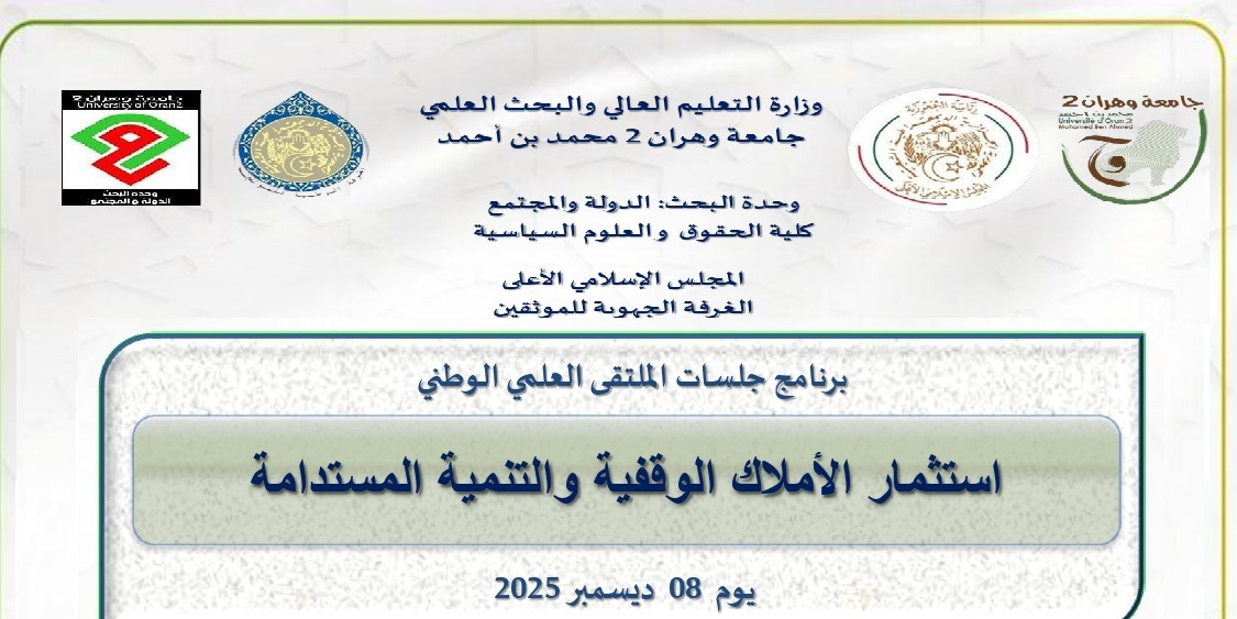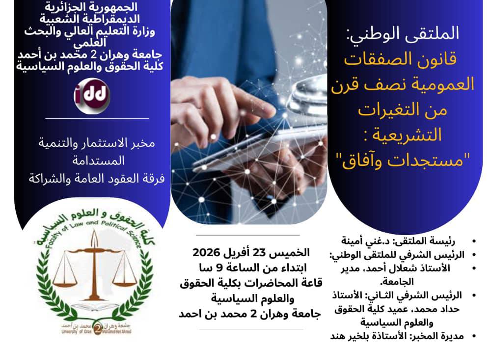المشاركة في الملتقى الوطني بعنوان: « قانون الصفقات العمومية: نصف قرن من التغيرات التشريعية – مستجدات وآفاق »، الذي ينظمه مخبر الاستثمار والتنمية المستدامة – فرقة العقود العامة والشراكة، وذلك يوم الخميس 23 أفريل 2026 بقاعة المحاضرات بكلية الحقوق آخر أجل لإرسال المداخلة كاملة: من 01 إلى 30 ديسمبر 2025