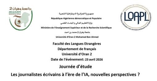 Appel à communications #JournéedEtude La Faculté des Langues Étrangères de l’Université d’Oran 2 Mohamed Ben Ahmed, à travers le laboratoire LOAPl département de français, a le plaisir d’inviter les enseignants-chercheurs, chercheurs et doctorants à participer à la journée d’étude nationale intitulée : « Les journalistes écrivains à l’ère de l’IA, nouvelles perspectives ? » 📍 Date de l’événement : 23 avril 2026