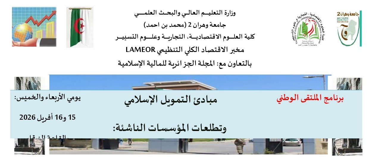 إعلان عن #ملتقى_وطني تنظم #جامعة_وهران2_محمد_بن_أحمد، ممثلة في كلية العلوم الاقتصادية والتجارية وعلوم التسيير، ومخبر الاقتصاد الكلي التنظيمي (LAMEOR)، وبالتعاون مع المجلة الجزائرية للمالية الإسلامية، ملتقى وطنياً بعنوان: "مبادئ التمويل الإسلامي وتطلعات المؤسسات الناشئة: بين فرص الابتكار وضرورة الامتثال الشرعي" 📅 وذلك يومي: 15 و16 أفريل 2026 📍 بالقاعة الزرقاء