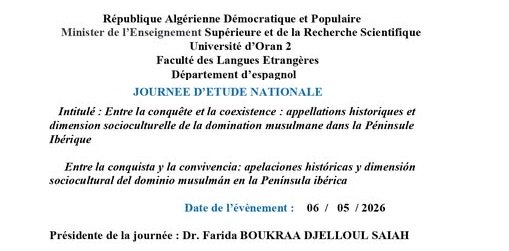 Appel à communications #JournéedEtude La Facultad de Lenguas Extranjeras de la Universidad de Orán 2 Mohamed Ben Ahmed, a través del Departamento de Español, tiene el placer de invitar a docentes-investigadores, investigadores y doctorandos a participar en la jornada de estudio titulada: « Entre la conquista y la convivencia: apelaciones históricas y dimensión sociocultural del dominio musulmán en la Península Ibérica » 📅 Fechas importantes : 🔹 Envío de resúmenes: del 02 al 15 de abril de 2026 🔹 Notificación de aceptación: 17 de abril de 2026 🔹 Fecha de la jornada: 06 de mayo de 2026